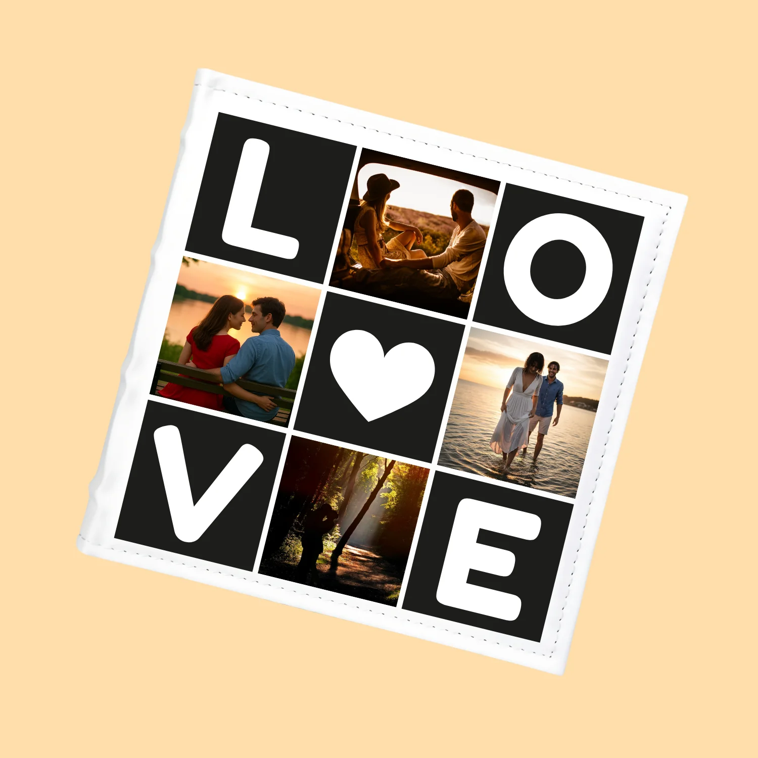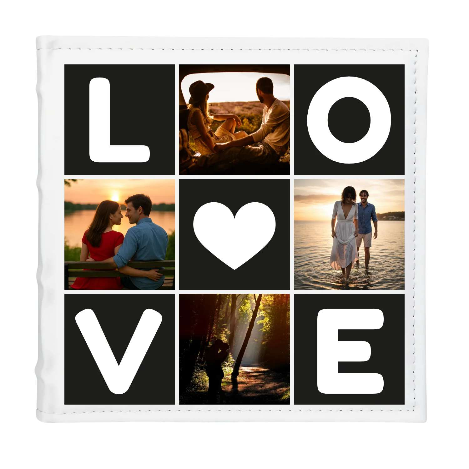Wyjątkowy, personalizowany album na zdjęcia w formacie 22×22 cm, którego okładka mówi sama za siebie – LOVE. Cztery litery, serduszko i miejsce na 4 fotografie sprawiają, że album staje się niepowtarzalną pamiątką pełną uczuć.
