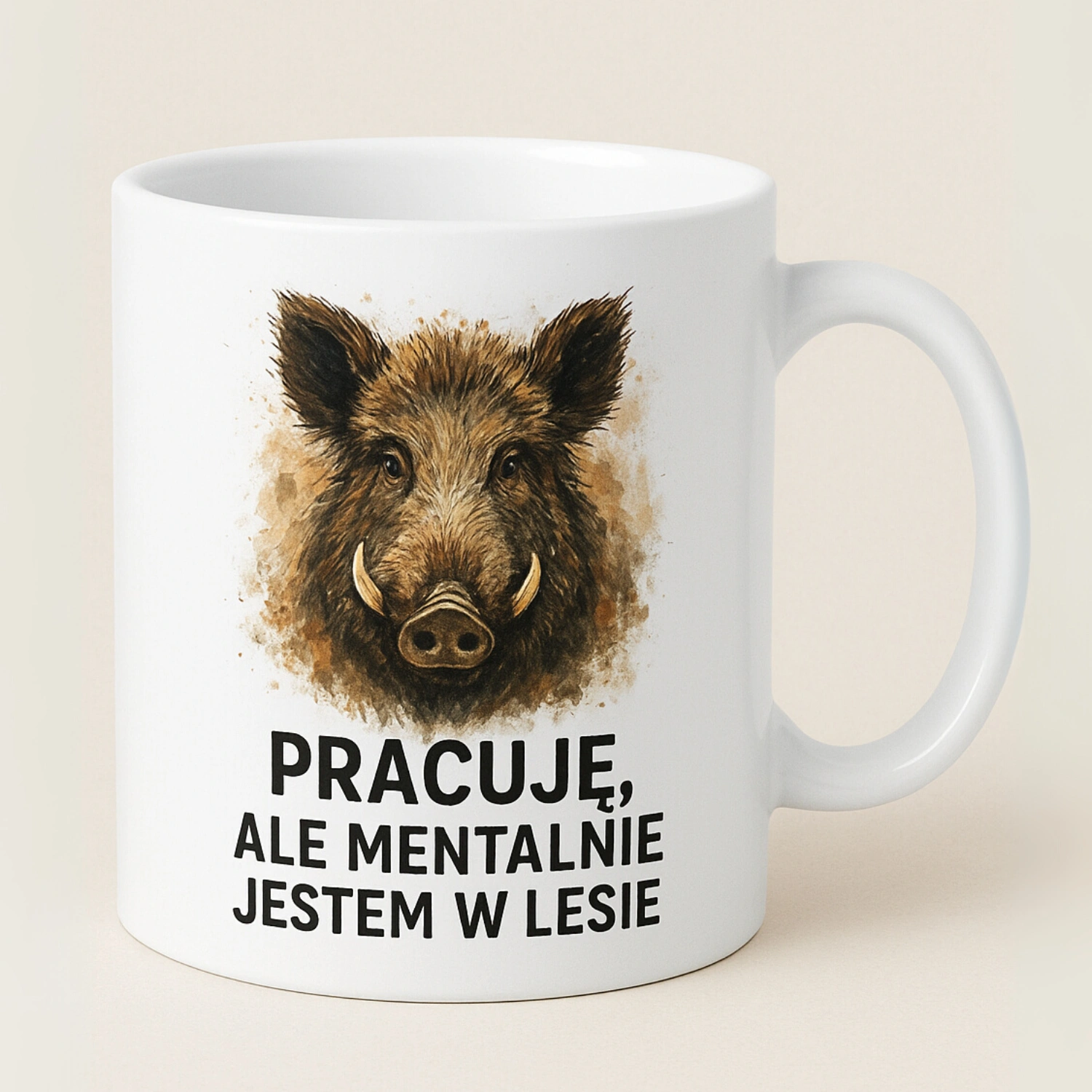 Codziennie w biurze, ale myślami zupełnie gdzie indziej? Ten kubek mówi wszystko za Ciebie. Kubek z nadrukiem dzika i napisem „Pracuję, ale mentalnie jestem w lesie” to humorystyczny gadżet, który rozumie realia życia zawodowego – ciało przy komputerze, dusza wśród drzew.