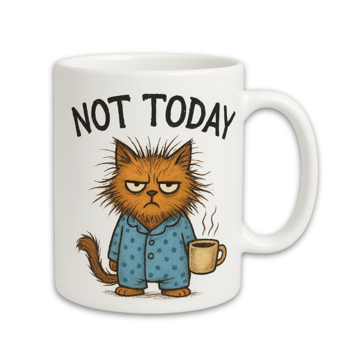 Nie każdy poranek zaczyna się łatwo… 🐱 Kubek z kotem w piżamie, włosami na wszystkie strony i parującą filiżanką kawy idealnie oddaje te momenty, gdy jedyne, co chcesz powiedzieć, to „Nie dzisiaj!”. Zabawnym designem rozładowuje poranny chaos i wprowadza uśmiech nawet w najbardziej ospałe dni.