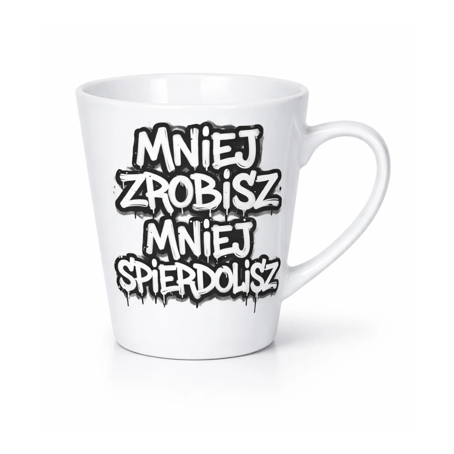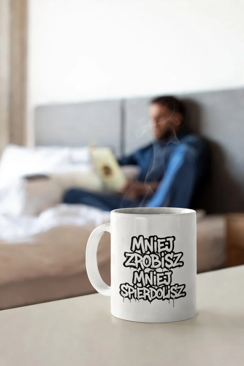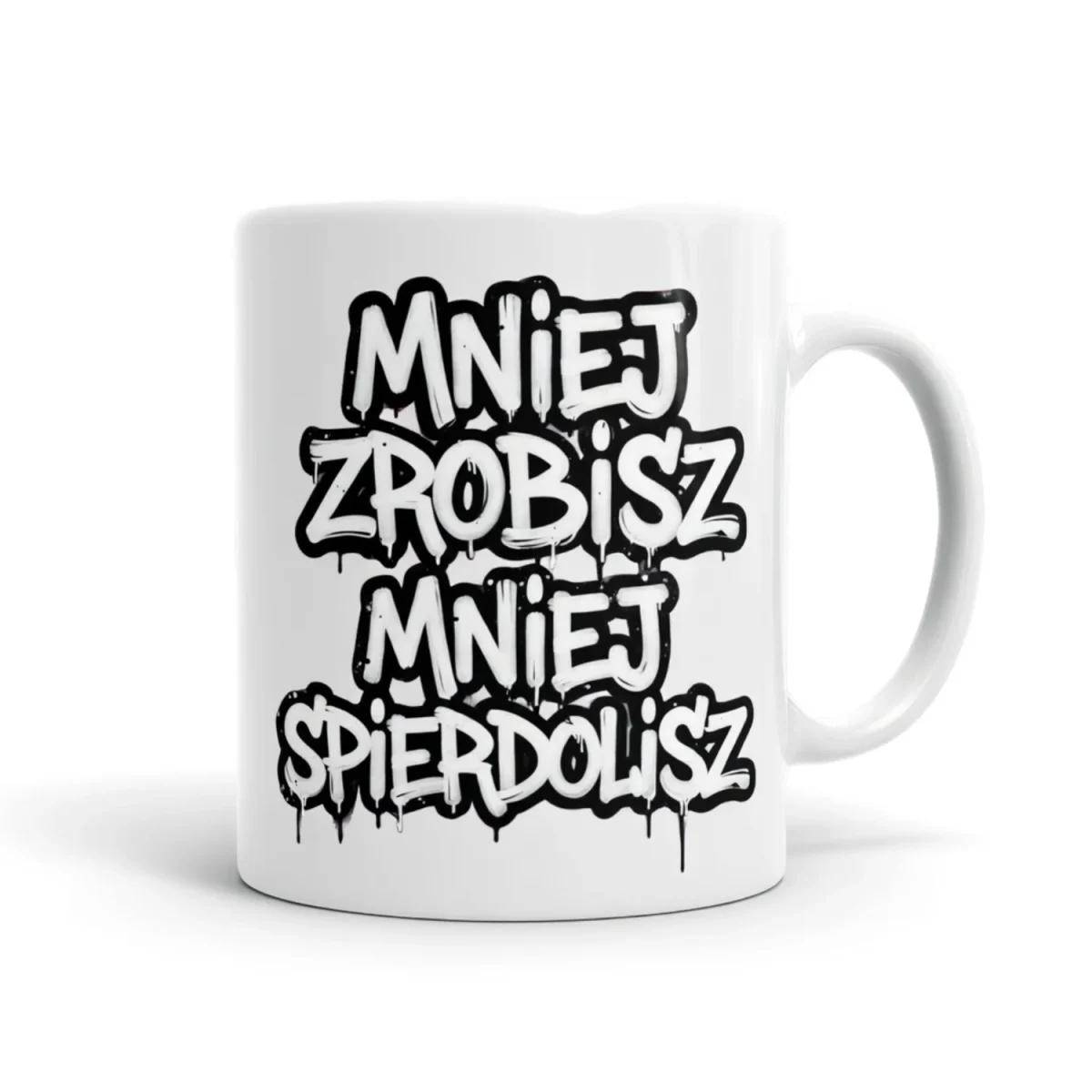 Kubek „Mniej zrobisz, mniej spierdolisz” – życiowa mądrość w ceramicznej formie