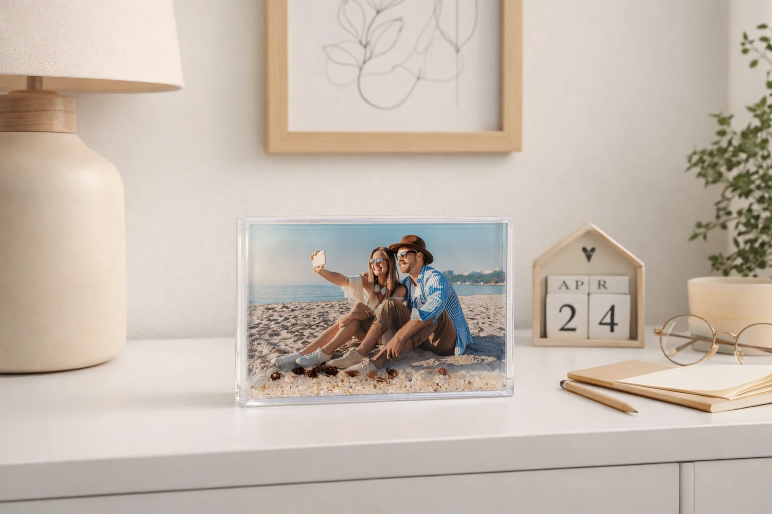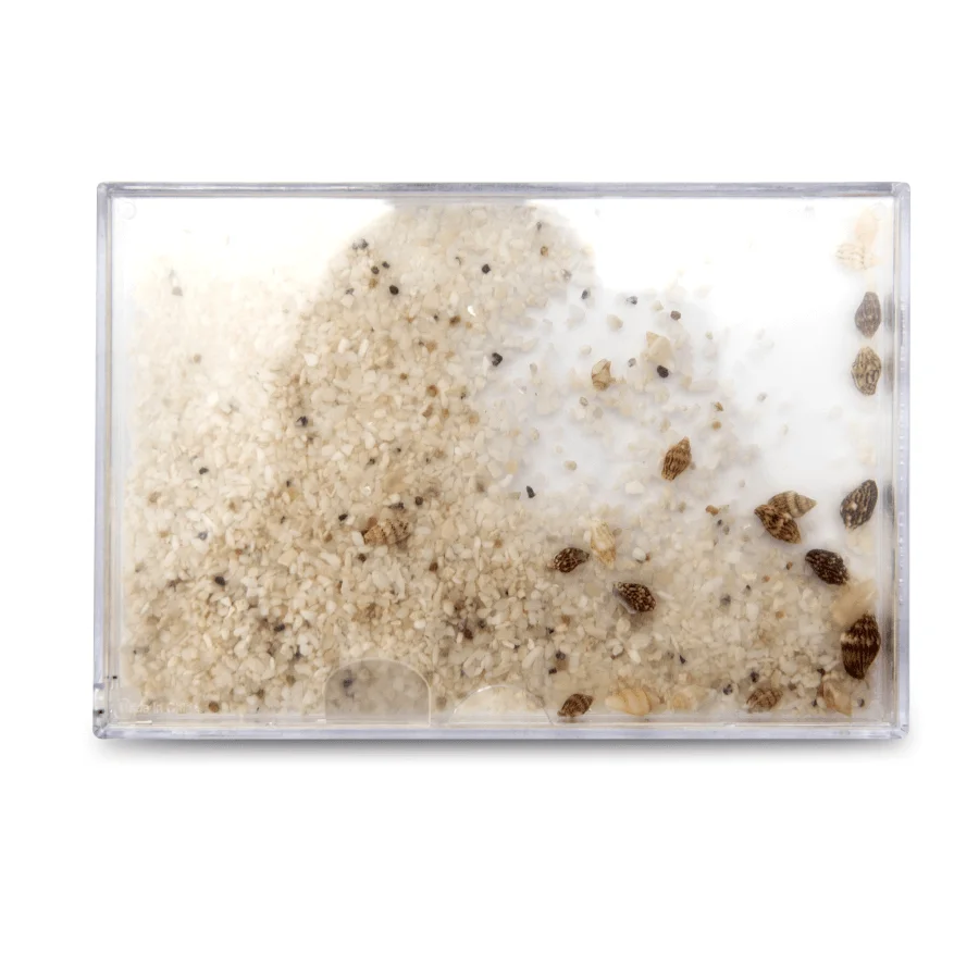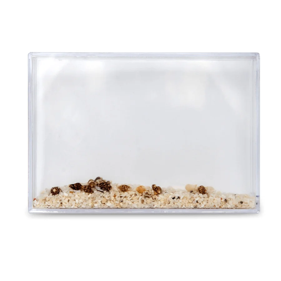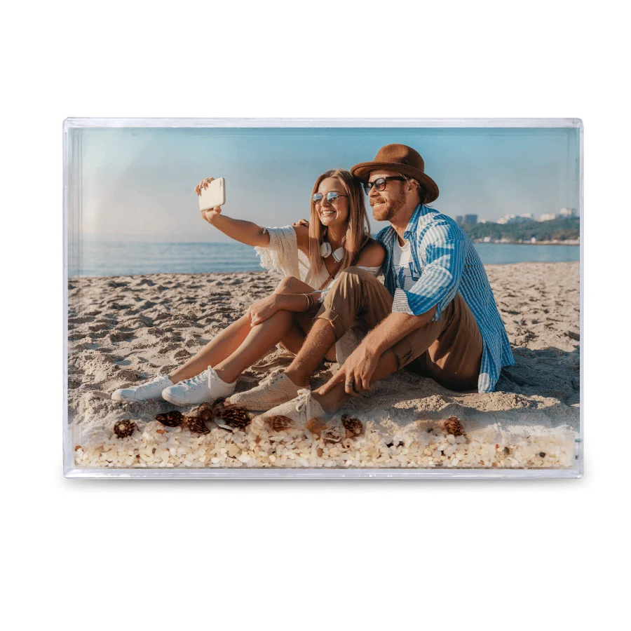 Przezroczysta ramka wypełniona wodą oraz drobnym piaskiem i dekoracyjnymi muszelkami tworzy efekt delikatnego, ruchomego krajobrazu. Wystarczy lekko poruszyć ramkę, aby elementy zaczęły swobodnie przemieszczać się wewnątrz, przywołując skojarzenia z plażą, morzem i letnim relaksem.