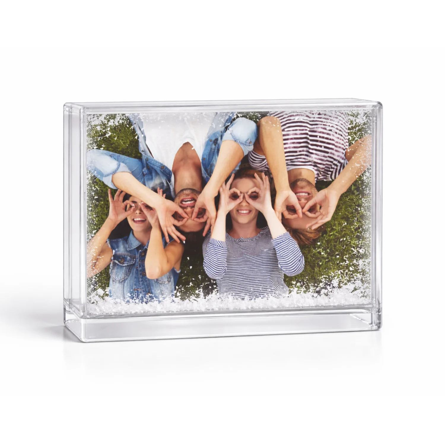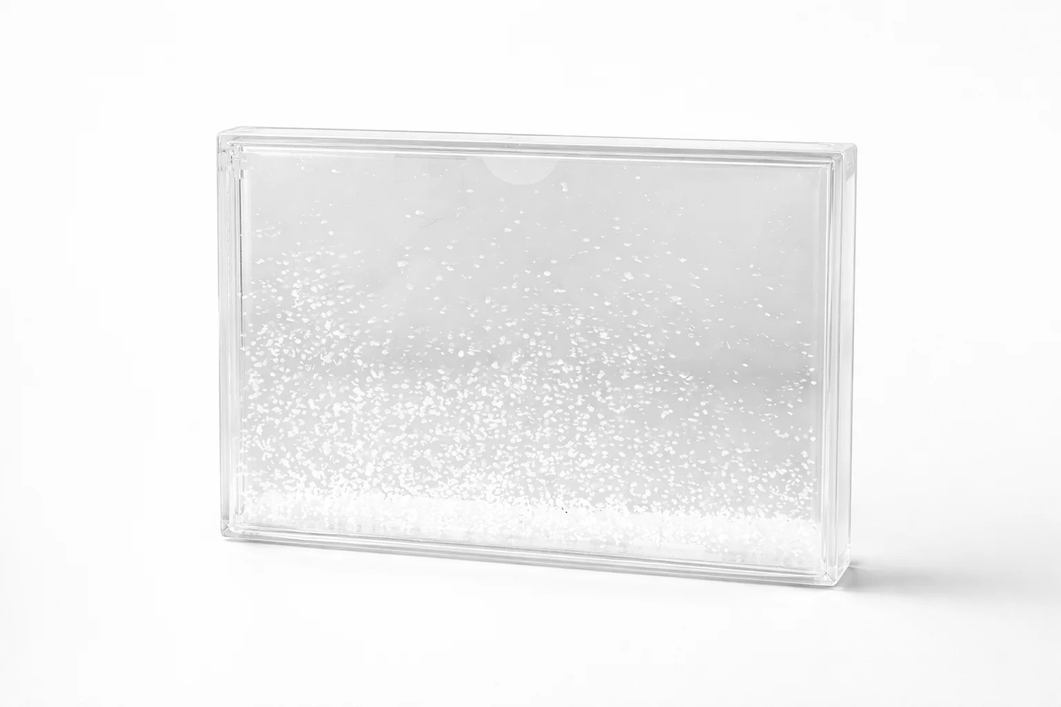 Przezroczysta ramka wypełniona wodą oraz konfetti w kształcie śnieżnych płatków tworzy efekt delikatnego opadu. Wystarczy lekko poruszyć ramkę, aby płatki zaczęły swobodnie unosić się i opadać, nadając fotografii niepowtarzalny klimat.