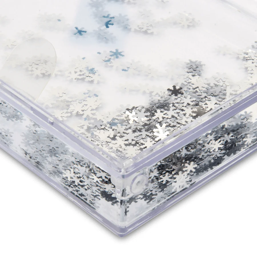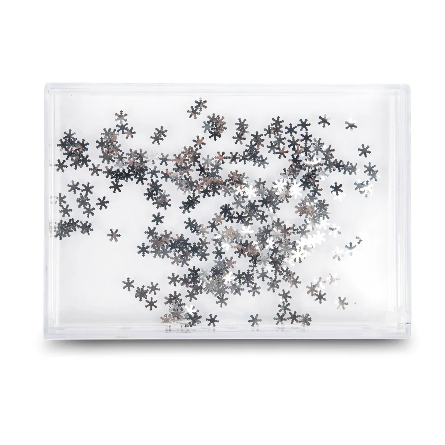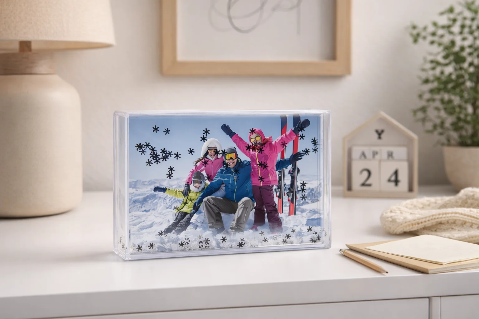Przezroczysta ramka wypełniona wodą oraz konfetti w kształcie srebrnych płatków śniegu tworzy efekt delikatnego, mieniącego się opadu. Wystarczy lekko poruszyć ramkę, aby płatki zaczęły swobodnie unosić się i opadać, subtelnie odbijając światło i podkreślając fotografię.